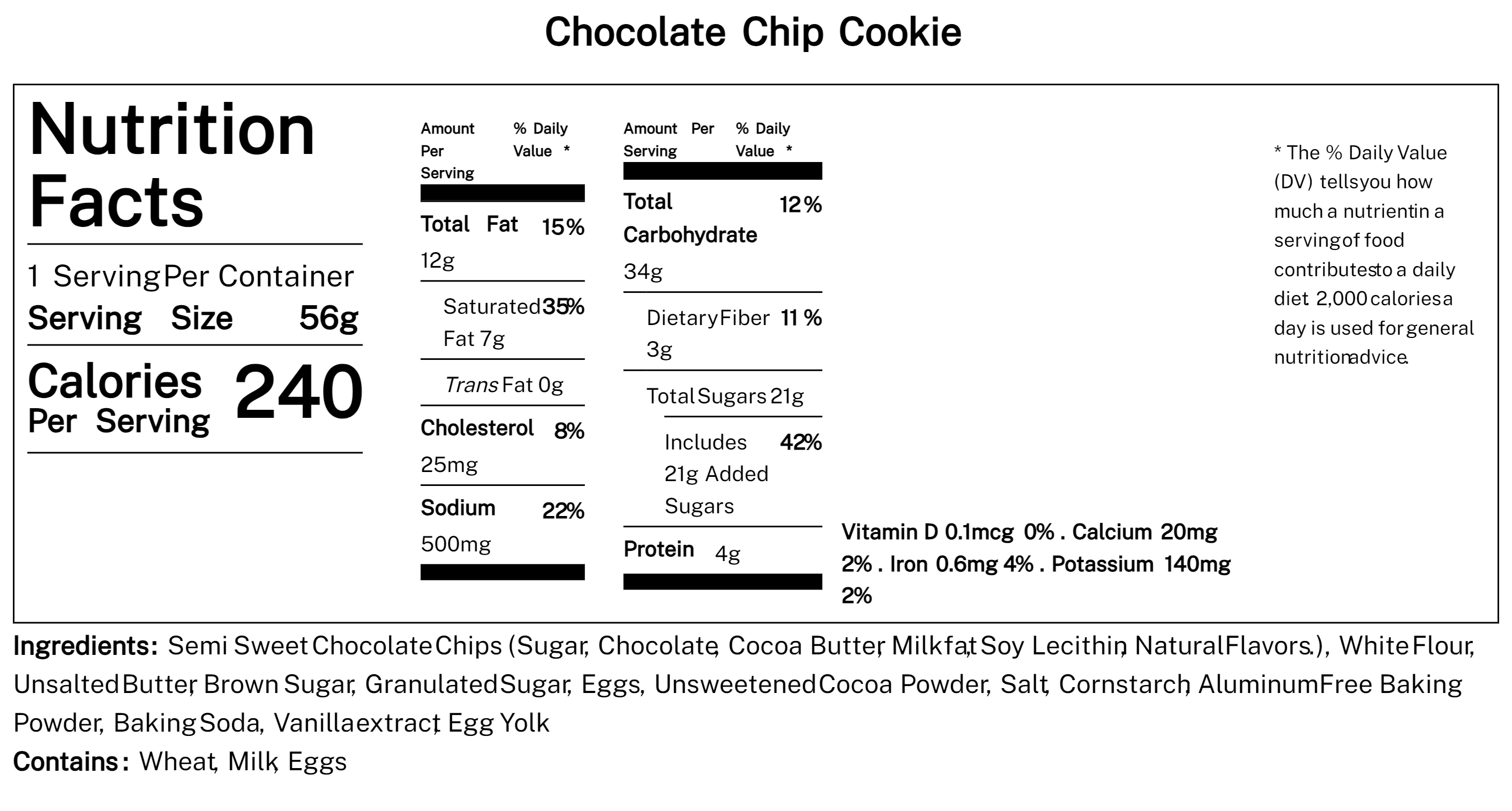 Flour, Sugar, Brown Sugar, Butter, Eggs, Cornstarch, Vanilla Extract, Salt, Baking Powder, Baking Soda, Chocolate Chips