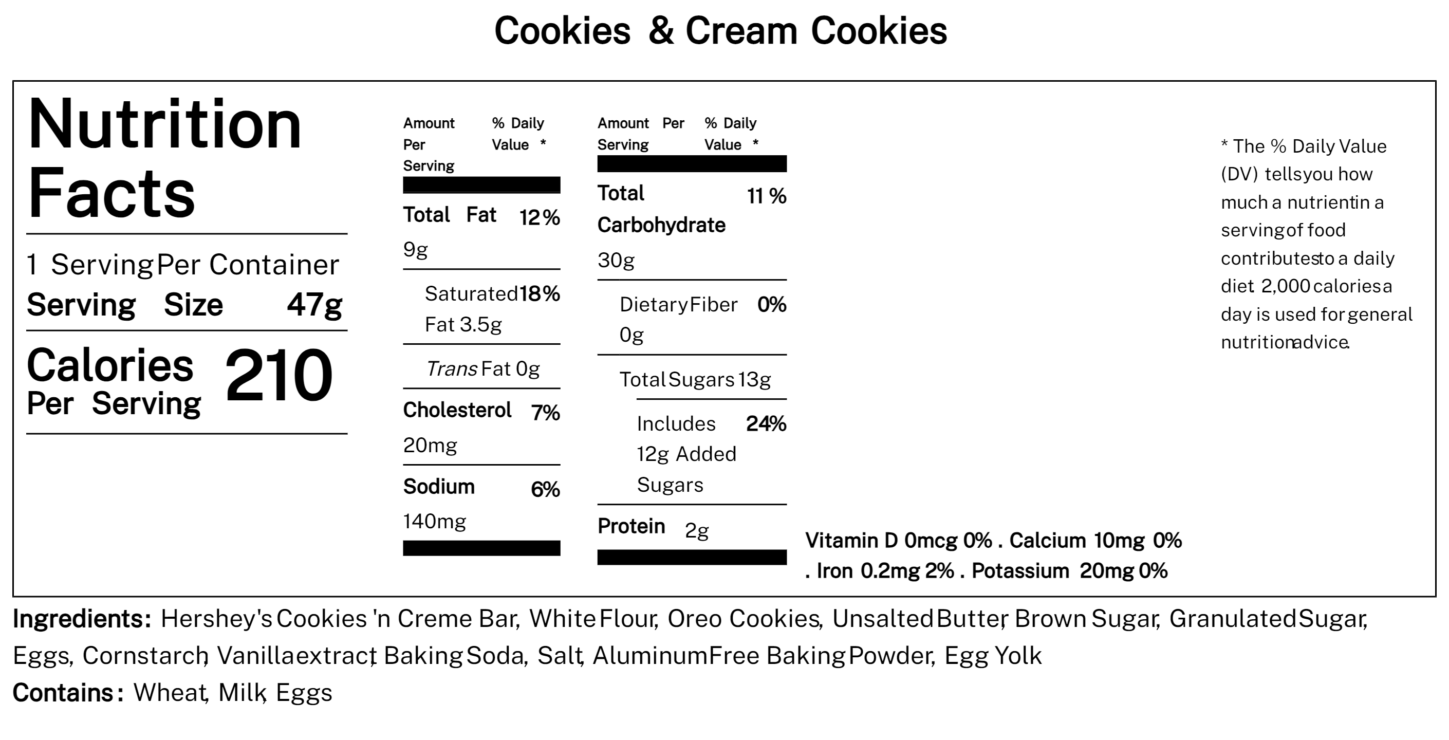 Flour, Sugar, Brown Sugar, Butter, Eggs, Vanilla, Cornstarch, Baking Powder, Baking Soda, Oreo’s, Hershey’s Cookies ‘n Crème Bar.