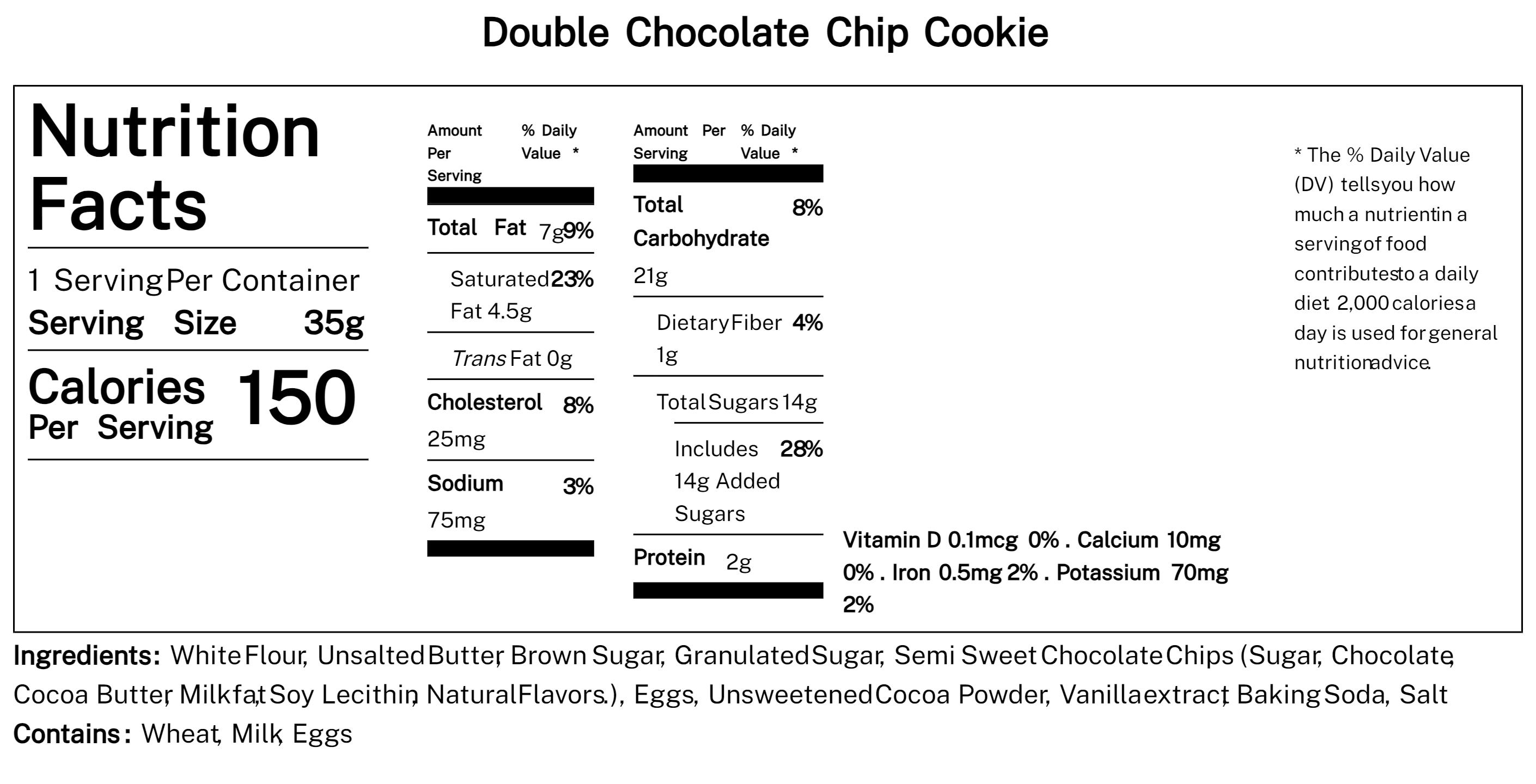 Flour, Cocoa Powder, Sugar, Brown Sugar, Butter, Egg, Vanilla, Baking soda, Salt, Chocolate Chips