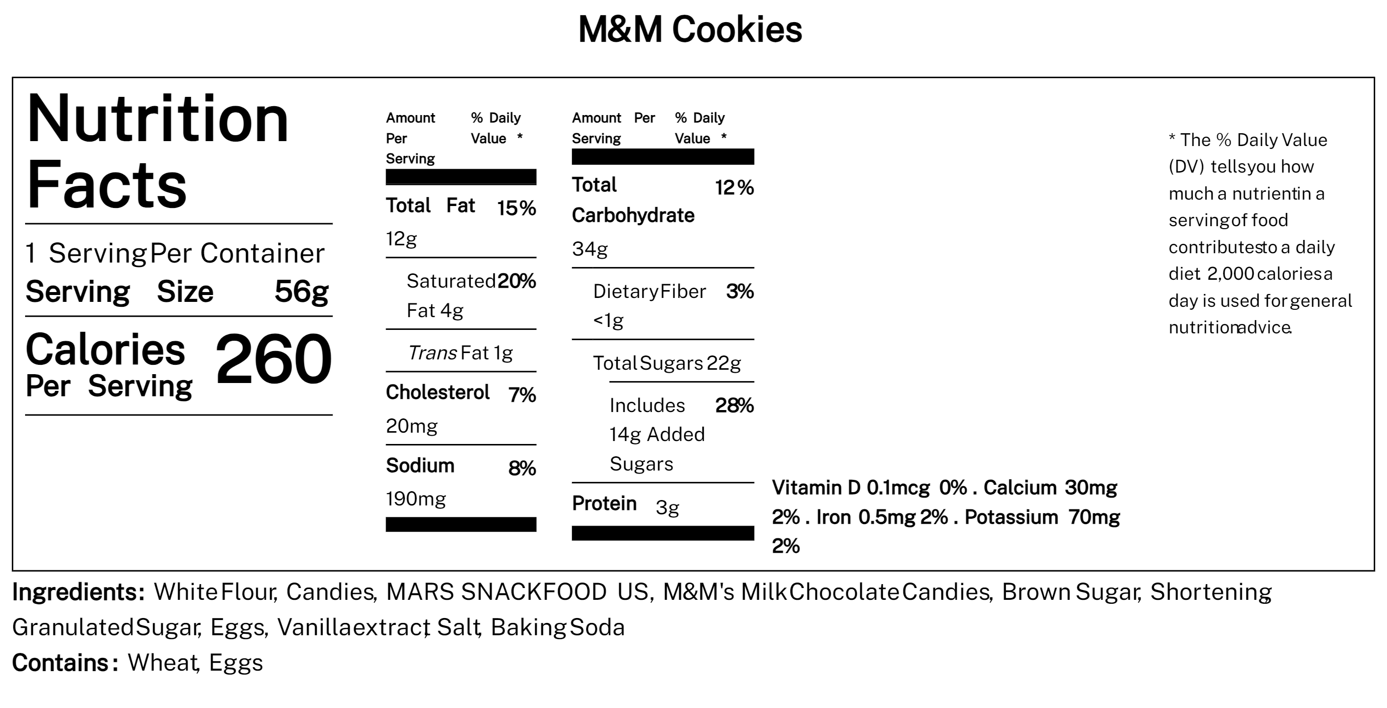 Flour, Sugar, Brown Sugar, Vegetable Shortening, Eggs, Vanilla, Salt, Baking Soda, M&M’s