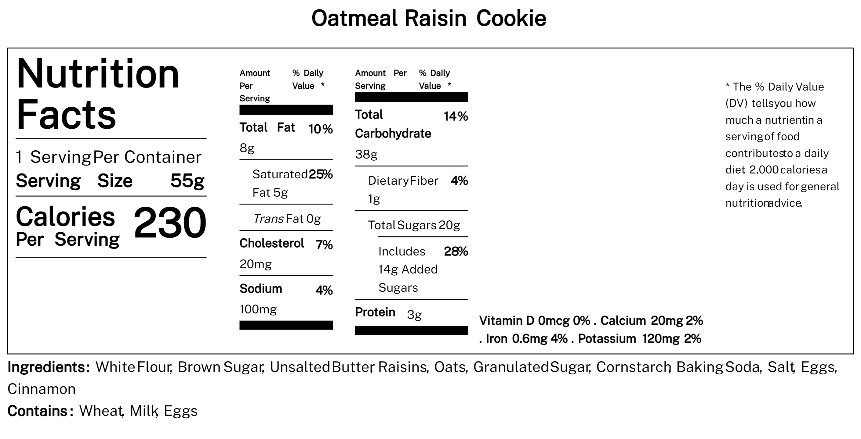 Flour, Oats, Sugar, Brown Sugar, Butter, Eggs, Raisins, Cornstarch, Baking Soda, Salt, Cinnamon