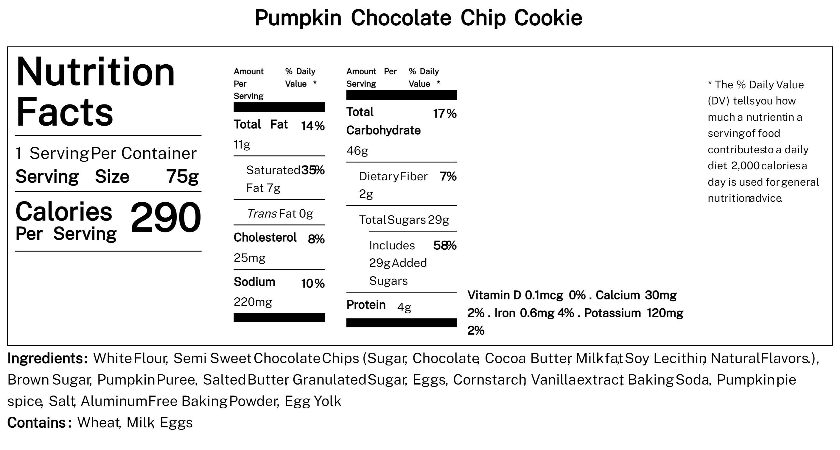 Flour, Pumpkin, Sugar, Brown Sugar, Butter, Corn Starch, Eggs, Vanilla, Baking Soda, Pumpkin Pie Spice, Salt, Chocolate Chips