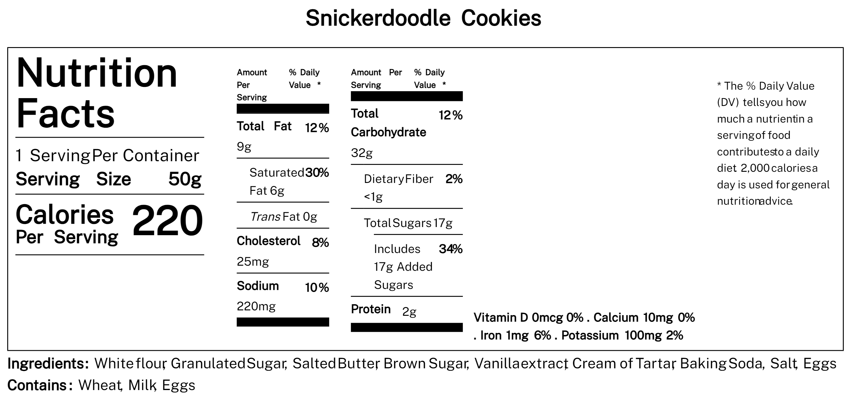 Flour, Sugar, Brown Sugar, Butter, Eggs, Vanilla, Cream of Tartar, Baking Soda, Salt, Cinnamon