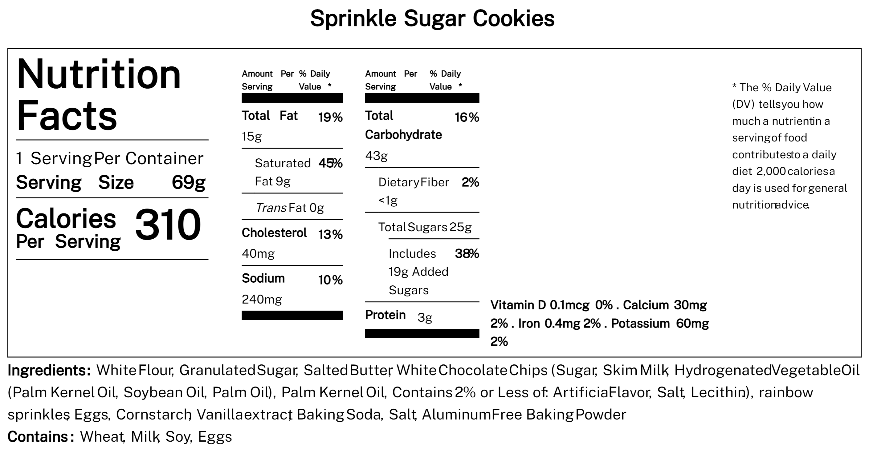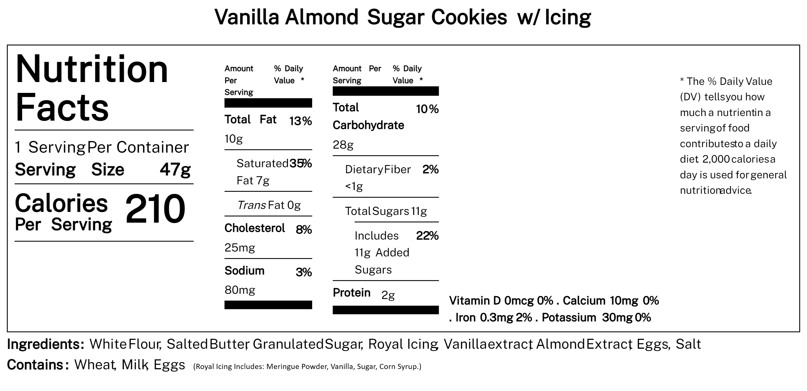 Flour, Sugar, Butter, Corn Syrup, Meringue Powder, Vanilla and Almond Extracts, Salt, Corn Starch, Edible Printer Ink.