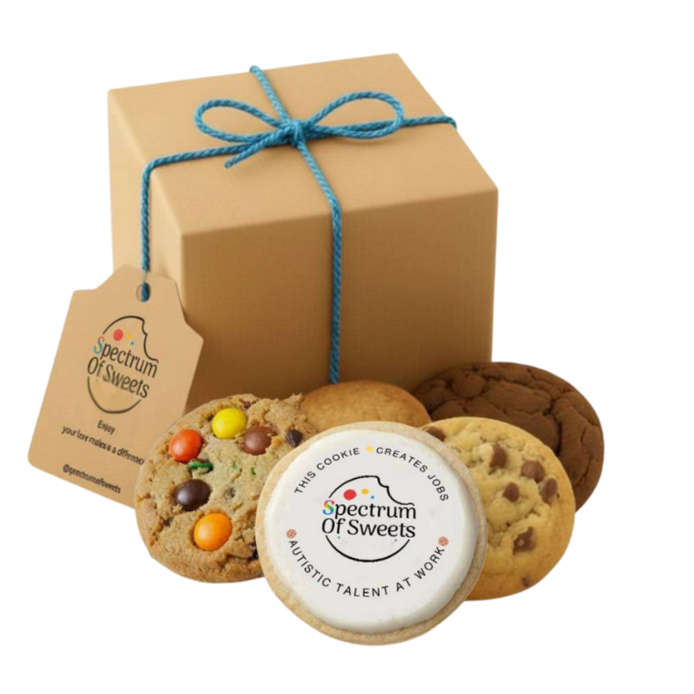 A small stack with big heart.  Four gourmet cookies, topped with a printed impact cookie that reads “This cookie creates jobs” and “Autistic Talent at Work.”